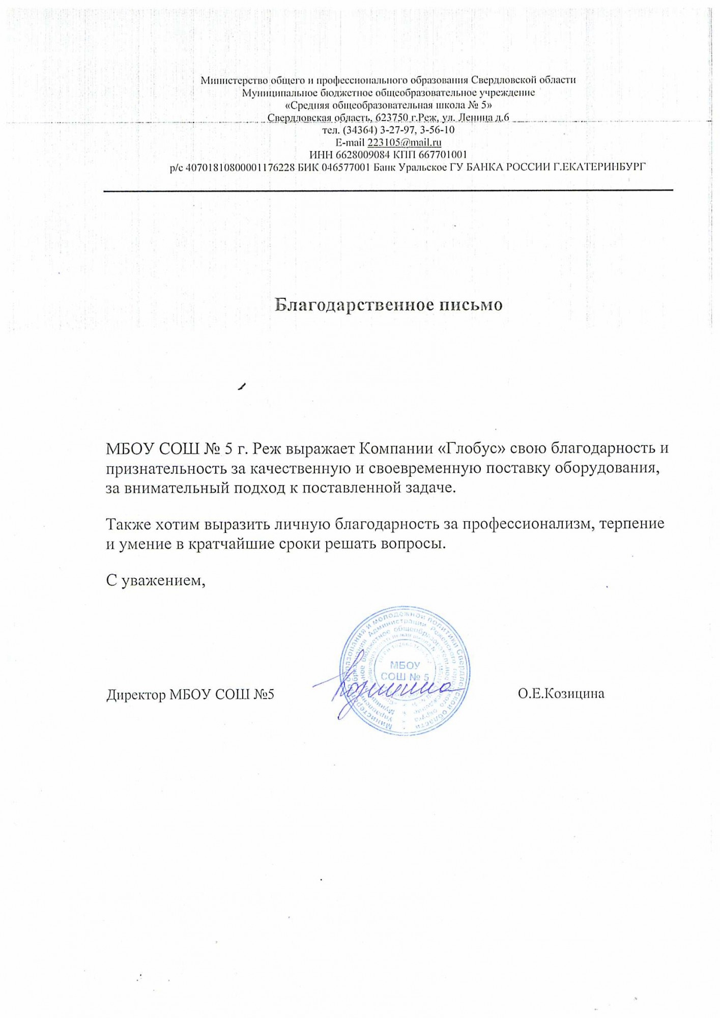 «Именно благодаря оперативным решениям менеджера Компании «Глобус» мы смогли реализовать проект «Современная школа» в срок»