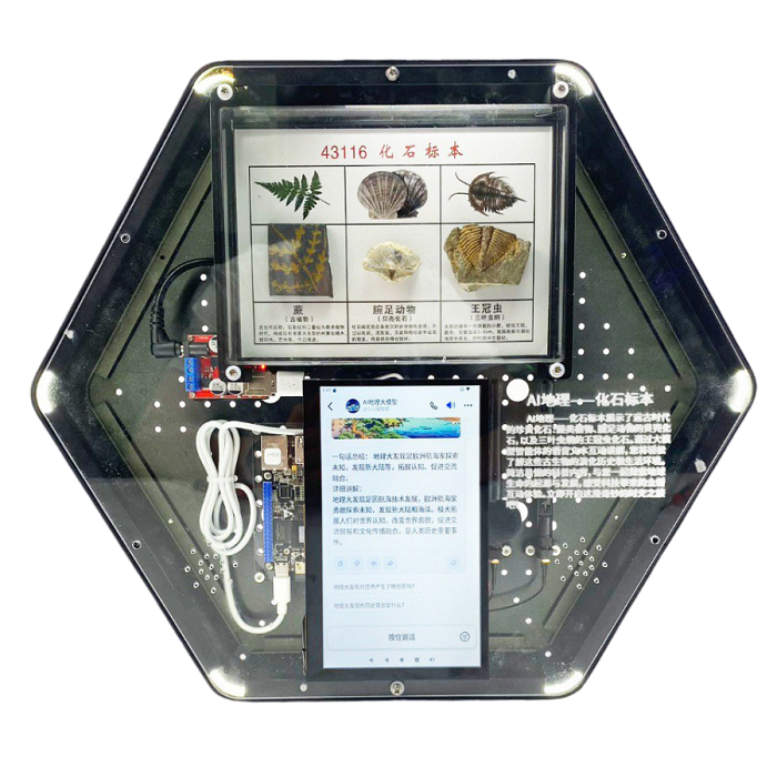 Интерактивный модуль для оформления зон рекреации, кабинетов, IT-полигона, библиотеки, медиа зоны. Благодаря интеллектуальному голосовому и текстовому взаимодействию ИИ вы можете легко узнать об эволюционной истории и среде обитания древних организмов, а также более детально изучить машинное обучение, базы данных, коммуникацию и алгоритмы ИИ. Модуль выполнен в форме шестиугольной призмы с интерактивным наполнением.
