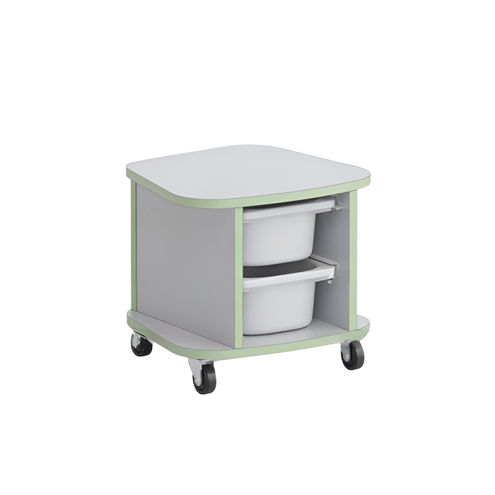 Табурет Робик выполнен в виде тумбочки из ламинированной ДСП 16 мм, края обрамлены кромкой ПВХ 2 мм и установлен на 4 колеса (два колеса с тормозом).