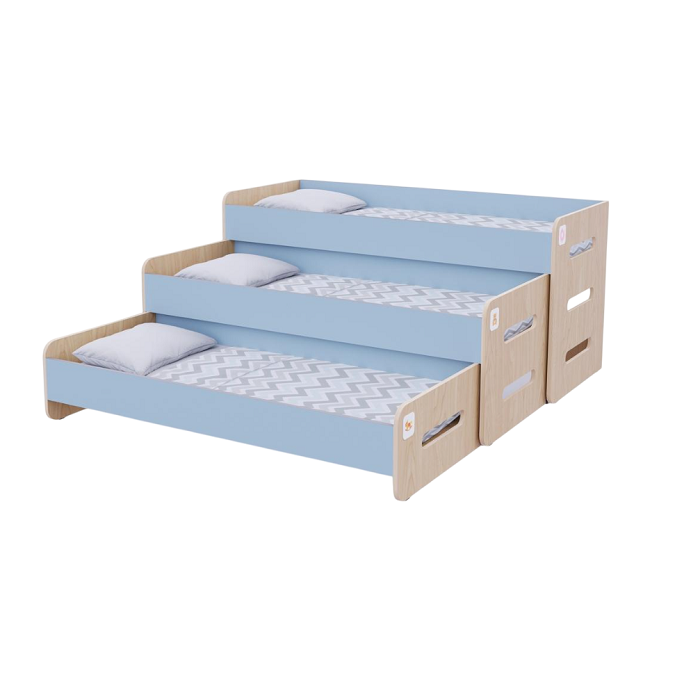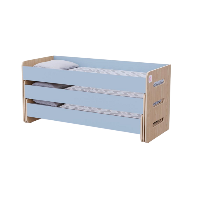 Раздвижная кровать из коллекции «НЕГА» для центральной группы детского сада. Идеальное решение для оптимизации пространства! Эта кровать обладает тремя секциями, которые легко раздвигаются, создавая удобное и безопасное спальное место для детей.