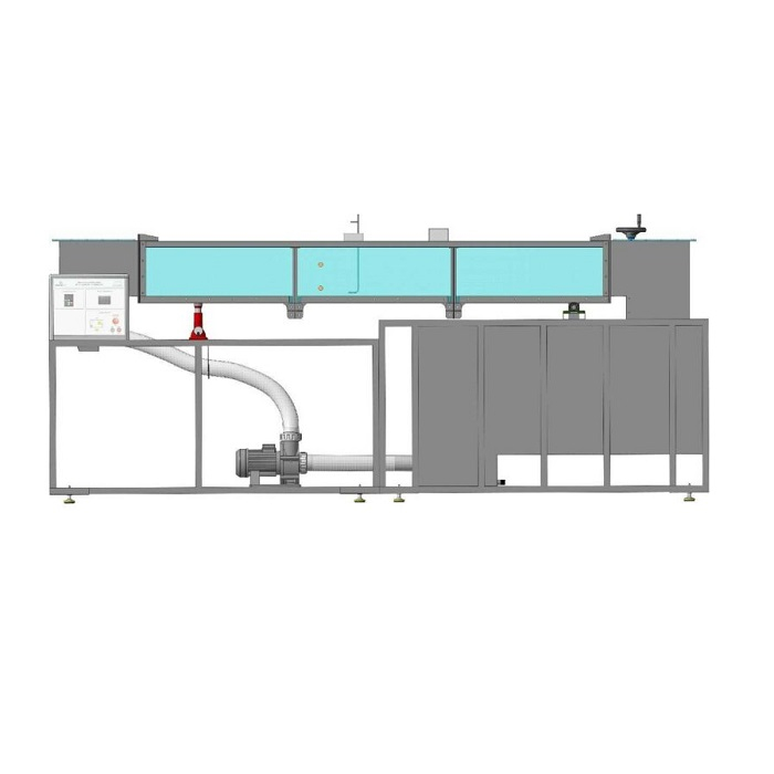 Проточная часть является основным элементам для проведения лабораторных работ. Проток представляет собой, сварную конструкцию из стали, с прозрачными вставками из акрилового материала, с механизмом качения и опорой для домкрата, также в конструкции имеются фланцы для присоединения напорного и сточного баков. В боковых частях протока, имеется механизм фиксации предназначенный для установки различных видов водосливов, разделителей и порогов. На выходе проточной части установлена механическая задвижка, изменение положения производятся при помощи рукоятки. Изменение угла наклона проточной части производится с помощью подъемного механизма. Измерение скорости потока осуществляется трубкой Пито.