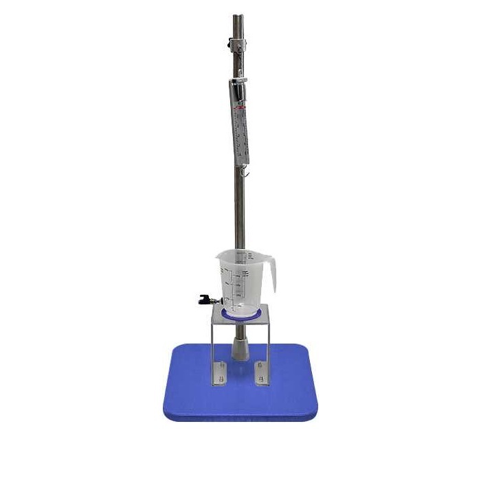 Оборудование выполнено в виде учебного стенда, конструктивно представляющее собой установленную на неподвижном основании вертикальную неподвижную стойку, на которой закреплен прецизионный динамометр с подвешенным грузом. Груз погружается в стоящий на лабораторном подиуме мерный стакан с жидкостью, глубина погружения регулируется путем вертикального перемещения динамометра по стойке с помощью лабораторного подъемника в виде втулки с регулируемой опорой.