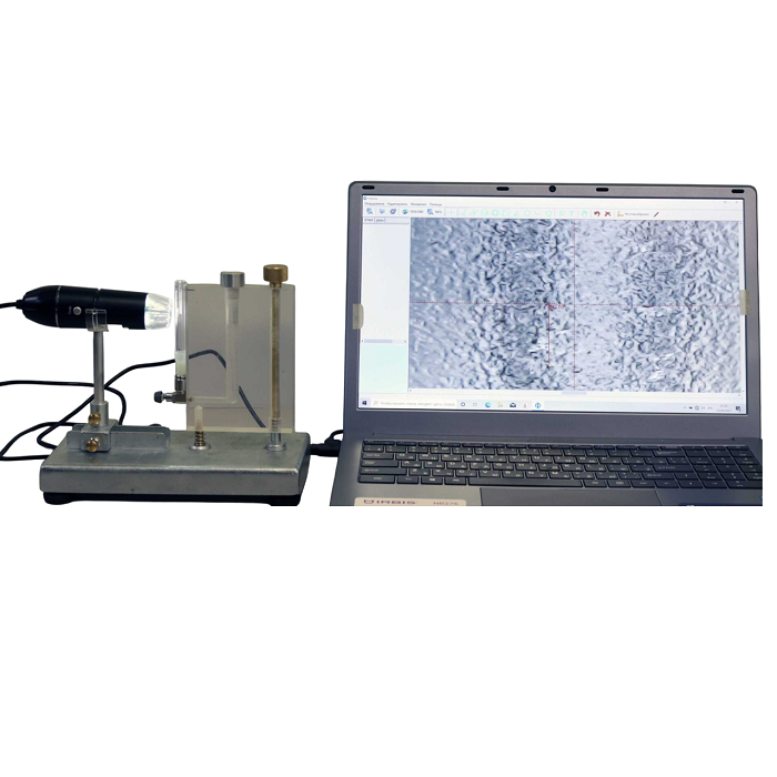 Лабораторная установка представляет собой сборную конструкцию из стали и подвижной моноблочной каретки. На стойке закреплен портативный цифровой USB-микроскоп. Каретка перемещается по вертикали вращением рифленой ручки, зафиксированной на винтовом механизме.