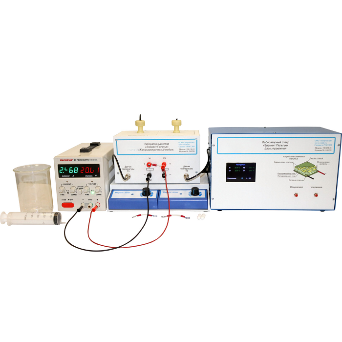 Лабораторный стенд «Элемент Пельтье» позволяет изучать характеристики элемента Пельтье калориметрическим способом.