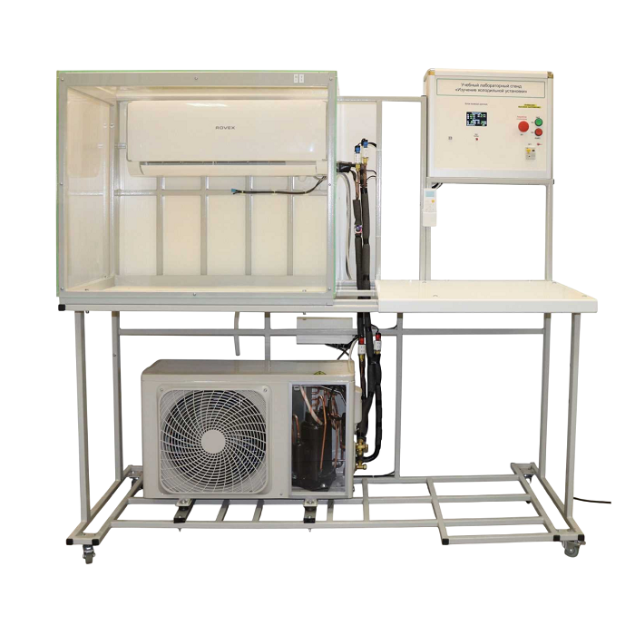 На раме смонтирована холодильная установка. В верхней части рамы установлен испаритель, помещенный в модель комнаты. В нижней части установлен конденсатор. На входе и выходе из испарителя и конденсатора установлены датчики давления и температуры, а также датчик температуры и влажности установлены в модели комнаты.