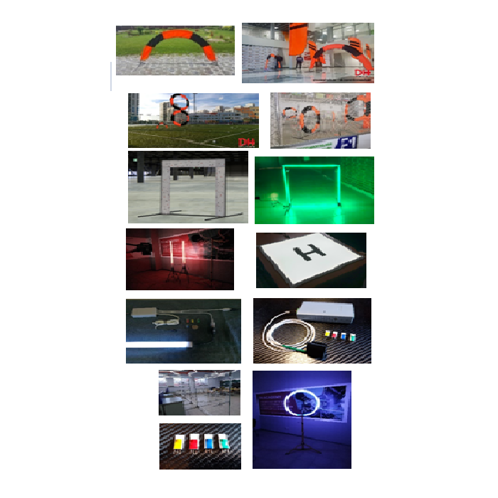 Трасса для проведения соревнований по дрон-рейсингу, включающая в себя поворотные флаги, курсовые ворота, площадку для взлета-посадки, систему автоматической фиксации пролетов.