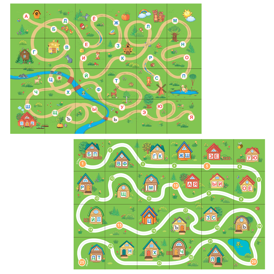 Поле разделено на квадраты, расстояние между центрами которых составляет 150 мм (шаг мини-робота Bee-Bot). На каждой из сторон поле имеет износостойкое покрытие с нанесенными полиграфическим способом красочными рисунками: на поле «Домики» в каждом квадрате, изображены домики с окошками, в которых расположены гласные и согласные буквы русского алфавита, выделенные разными цветами; на другой стороне – на поле «Сказка» изображены хорошо узнаваемые детьми сказочные персонажи или предметы из сказок, а также буквы русского алфавита.